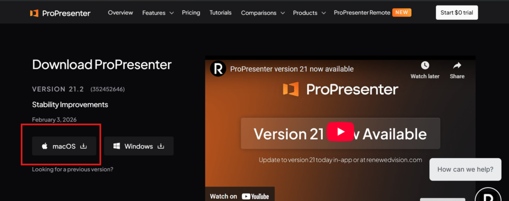 Once you are on the ProPresenter page, you will see download options Mac OS and windows systems.